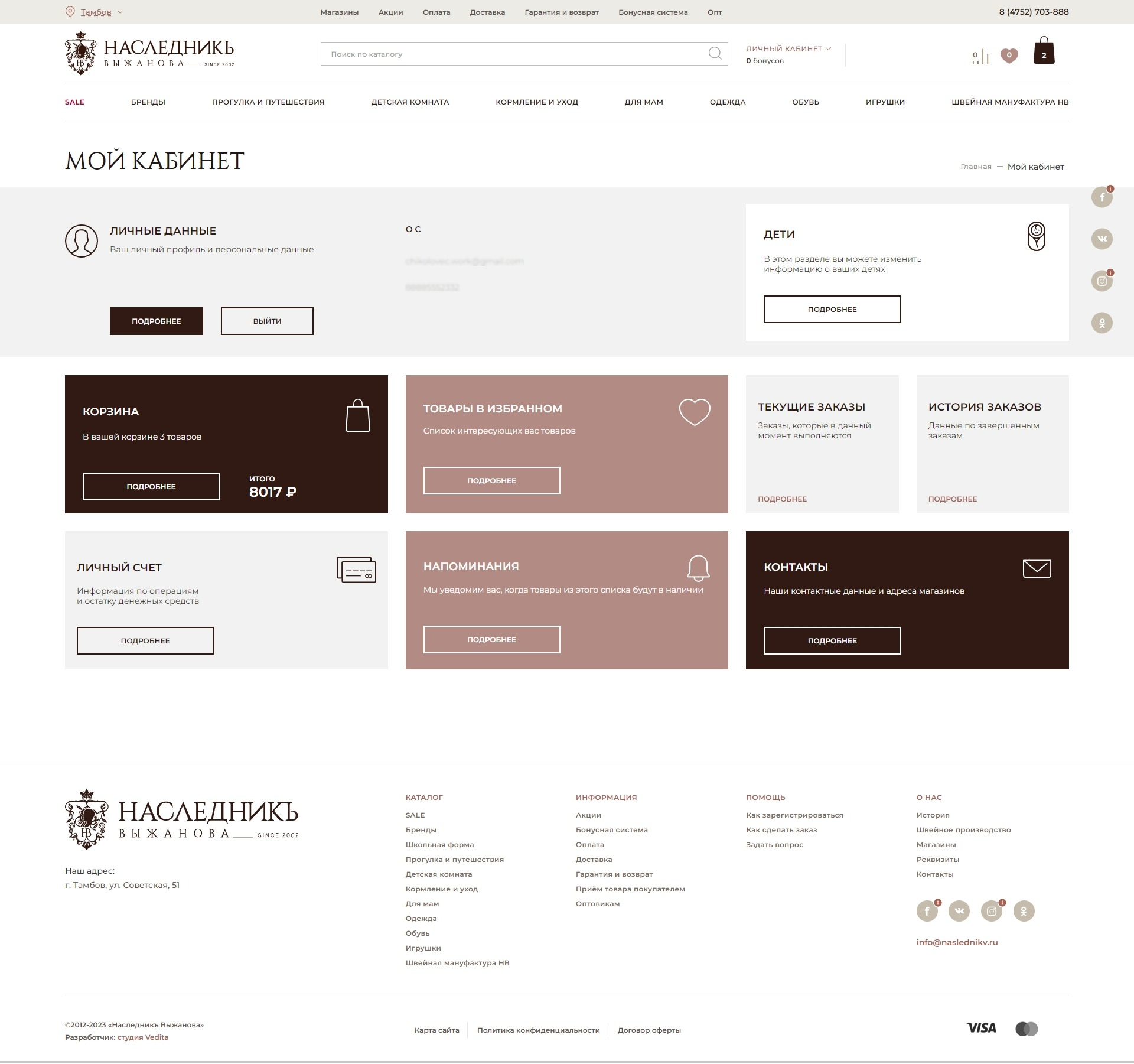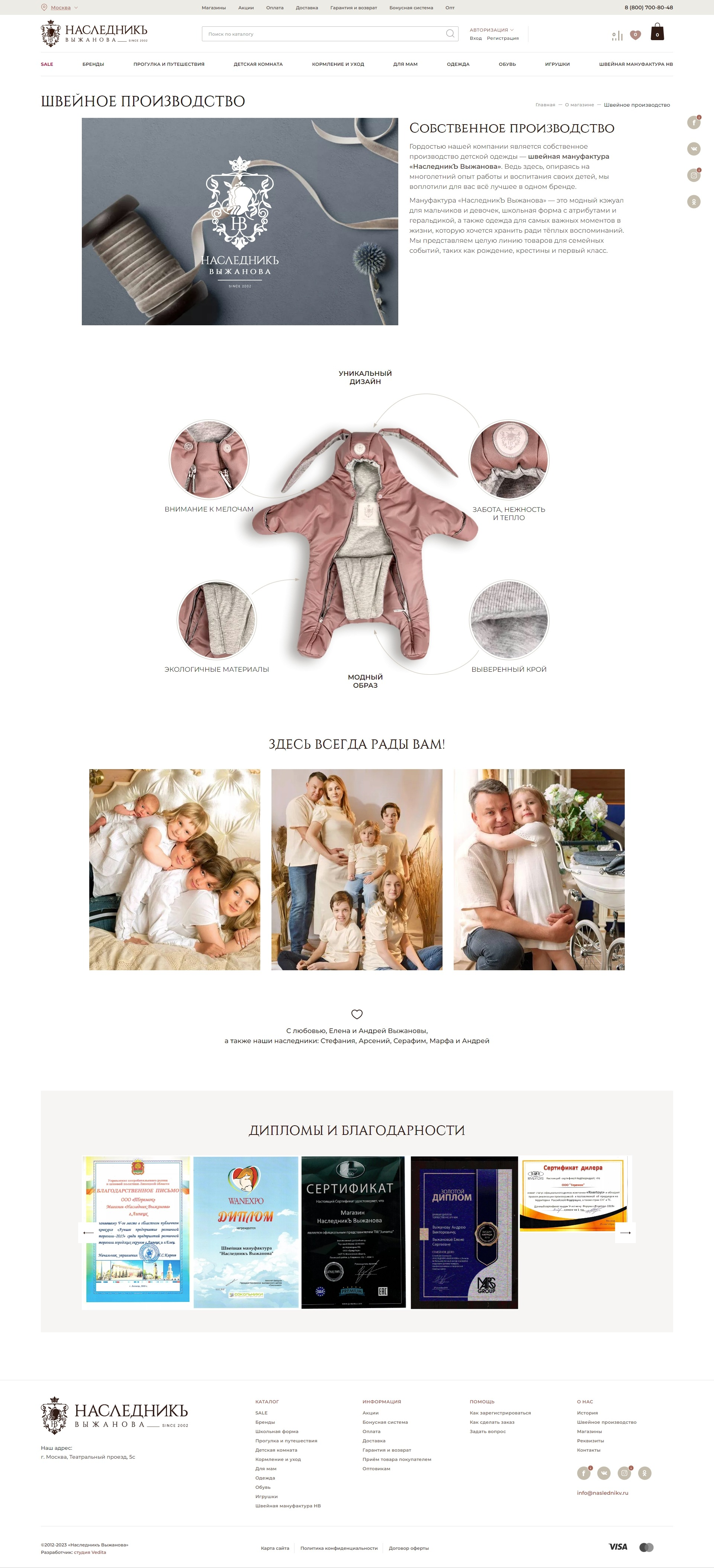 Благодаря интеграциям с 1С и CRM, на сайте «НаследникЪ Выжанова» автоматизированы и оптимизированы многие сложные и рутинные процессы, требующие повышенного внимания, “дополнительных рук”, опасных ошибками и пр.