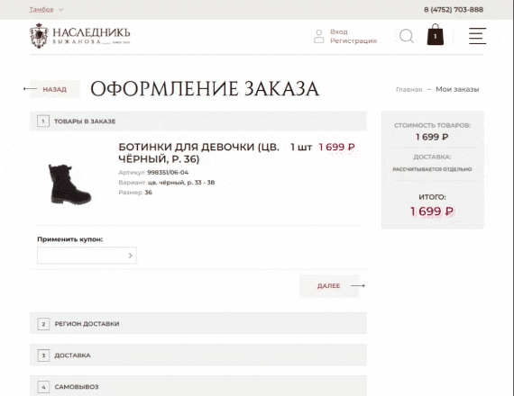 Оформить покупку с доставкой можно сразу, без предварительной регистрации — по введённым в корзине телефону и электронной почте.