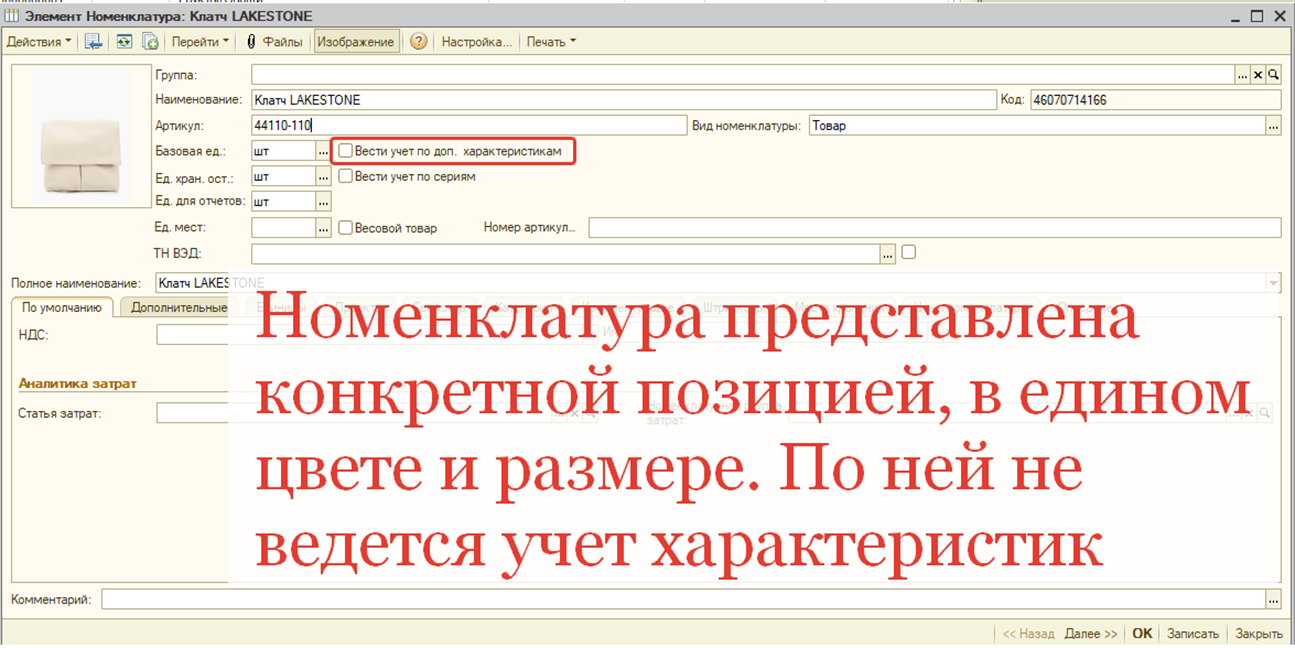 В 1С учет представлен как товарами, так и их характеристиками, т.е. «торговыми предложениями». Например, рубашка — это единая позиция номенклатуры, но имеет размеры, например 44, 46, 48.А сумка является уникальным товаром — потому, что она представлена только в одном цвете, в одном размере, выполнена из одного и того же материала, и никаких характеристик по ней заводить не нужно.